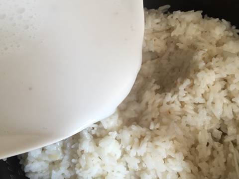 - Begitu ketan matang, masukan air santan yang tadi dimasak ke dalam ketan aduk2 pencet cook lagi di magicomnya