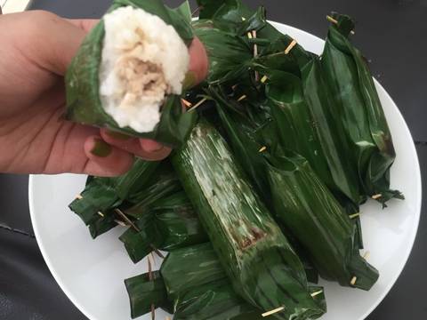 Ambil secukupnya ketan yang tadi, pipihkan tambahkan ayam secukupnya di tengah2 lalu bulatkan ๐ sperti gambar di contohBungkus dengan daun pisang bakar di atas pan atau pengorengan atau alat bakar sampe daun pisang gosong sedikit biar wangi - Lemper slesai siap dimakan ๐